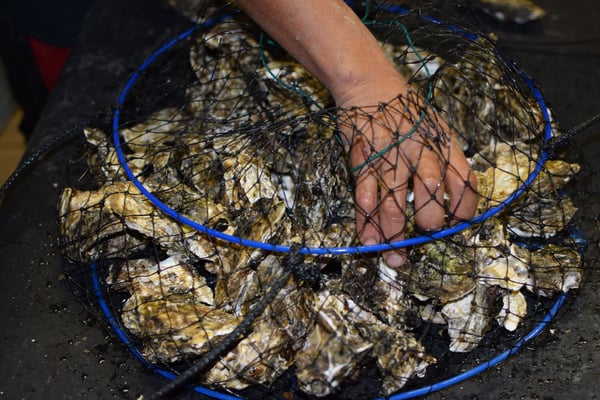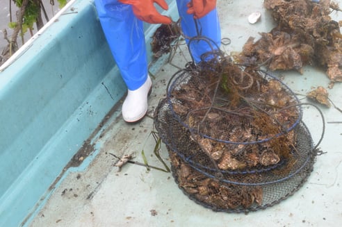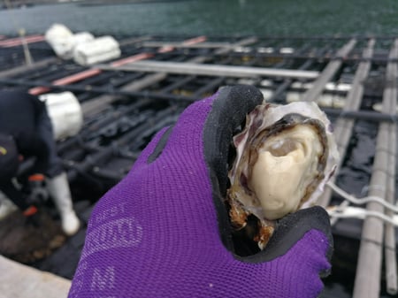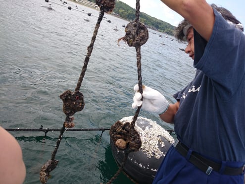 写真はフロート垂下のカルチ式養殖岩牡蠣を揚げてもらっているとこ。