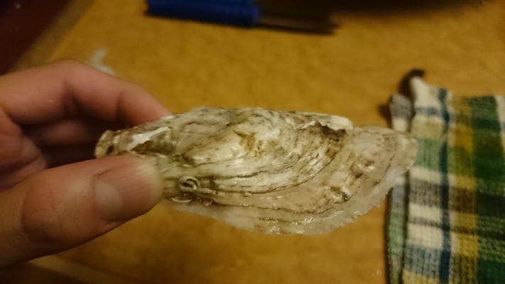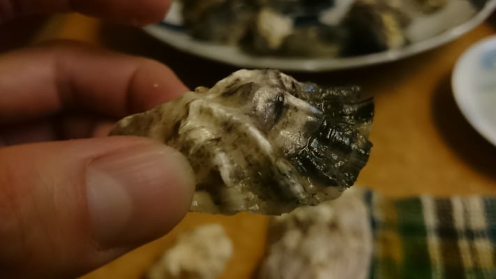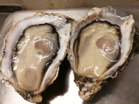 真牡蠣であれば、カップが深くて重いものが良い確率が高いですが、水がたくさん入っていて重いって可能性もあります。で、開けたら海水がドバーっと。