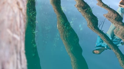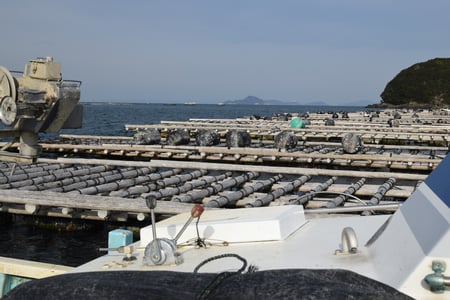 垂下式は「浮くもの」にロープをくくり付けて、海水の下に向かって垂らす方法。「浮くもの」は海によって筏を使うか、フロートを使うか。筏を使うにしても鉄か木か竹かで揺れ方が異なるので牡蠣のでき方は違うのよ、フロートもどんくらい繋げるかでね。